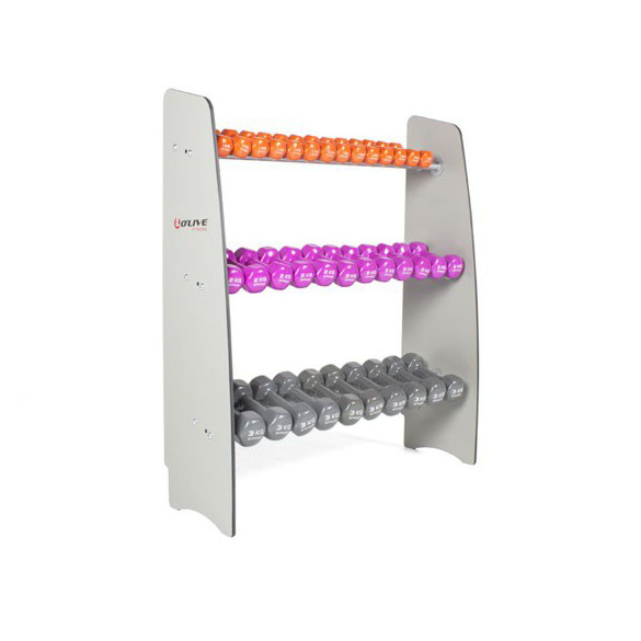 Including three trays to store any weight of dumbbells, either vinyl or rubber.