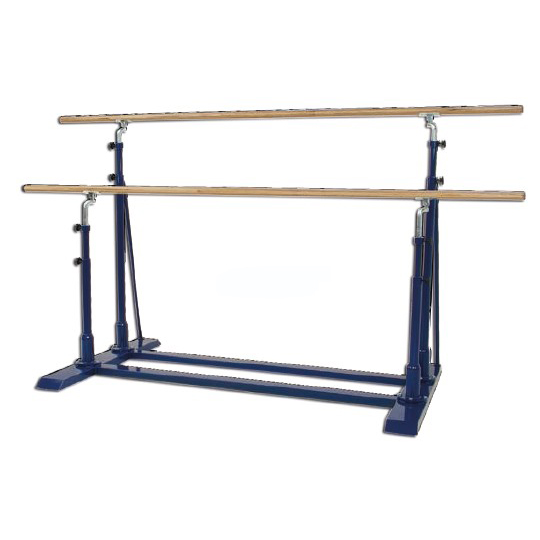 Heavy steel construction. Periscopical columns made of double steel tubes with an internal chromed slider, fully round, diameter 32mm, adjustable in width and height. Joint attachments in order to allow free flexing at the bars. Bars made of lamellar wood, length 350 cm. Made in EU.