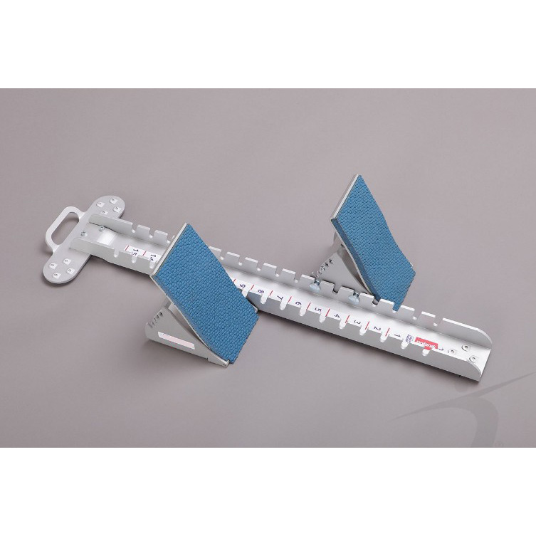 competition aluminium anodized, IAAF certificate no. E-16-0868, designed for high-level competitions for synthetic track, very light and durable pressed aluminium profiles, ergonomic shape of high comfortable foot supports, synthetic track lining specially shaped for better sticking to track, wide range of support inclinations (5 positions) and their reciprocal locations (15 positions), small weight 5,6 kg, fitted with comfortable handle, inclined block spikes for better anchoring in the track