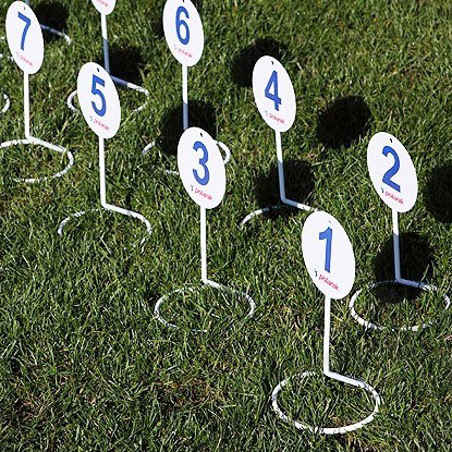 set of 15 markers to be put on the ground, made of steel, powder painted, dark blue visible digits