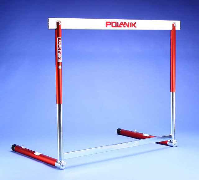 height levels: 762, 838, 914, 991, 1067, IAAF certificate no. E-99-0157, strong hurdle frame made of galvanized steel tubes and profiles, aluminium telescope tubes and hurdle feet anodized in red, equipped with spring-loaded button systems of hurdle toppling force and height adjustment, economical in transport collapsible construction.