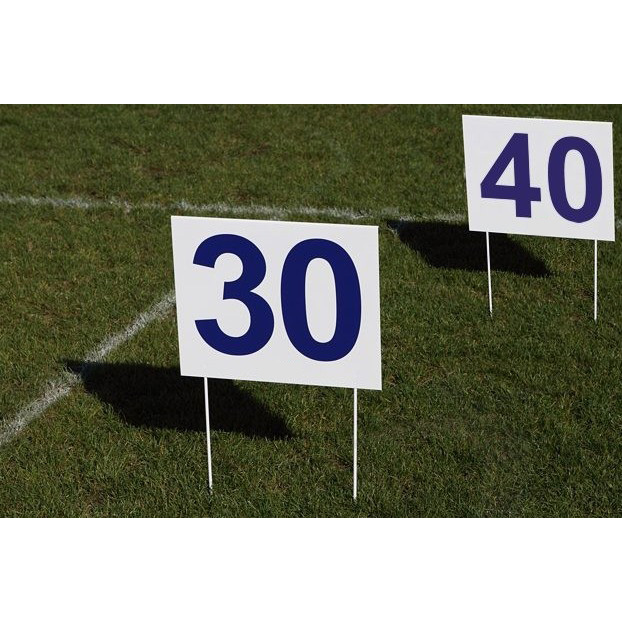 set of 14 markers, powder painted, digits on both sides, rectangular with two pins, designed for long distance throwing (discus, hammer and javelin), range from 30 m to 90 m increase by 10 m