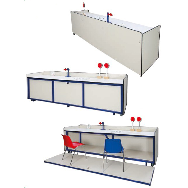 Judges table with varnished steel structure, wooden top and sides, closing platform for storing accessories, dimensions 300x70x76 cm, mobile on wheels