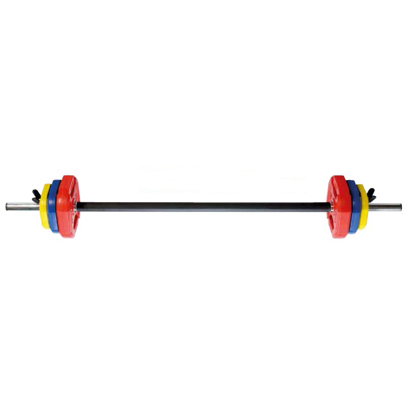 Get Fit Set with bar, 2 fasteners and 2 rubber plates with grips each of 1,25 kg yellow, 2,50 kg blue and 5,00 kg red.