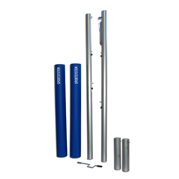 Varnished aluminium round section 100 mm volleyball system with ground sockets, net tensioner and protective pads, in accordance to DIN 7896